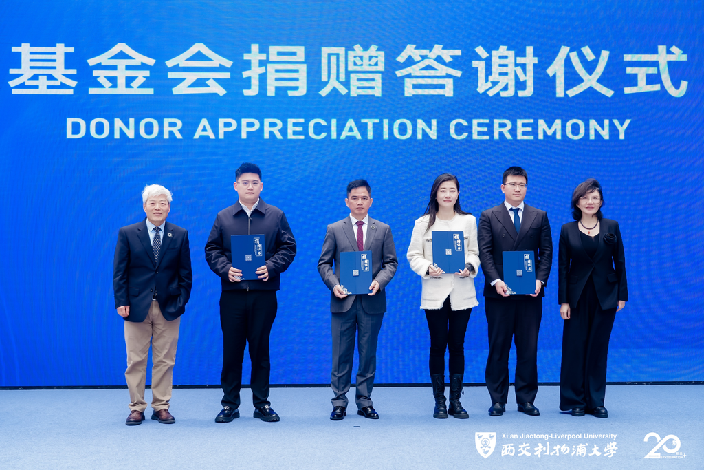 The event also included a donor appreciation ceremony, recognising four contributors across clean energy, semiconductors, and education: Chunxuan Li, Chairman of Intercontinental Green Power (Hainan) Co.; Fangfang Xu at Jiangsu Shenzhou Semiconductor Technology; Yiheng Cao, Chairman of Suzhou Pujing Fengtu Education Technology; and Yunyu Jia, an XJTLU alumnus and also General Manager of Ruikun Education Technology Development (Suzhou). Each received certificates presented by Professor Xi and Professor Qiuling Chao, Vice President for Student Affairs and Information at XJTLU.