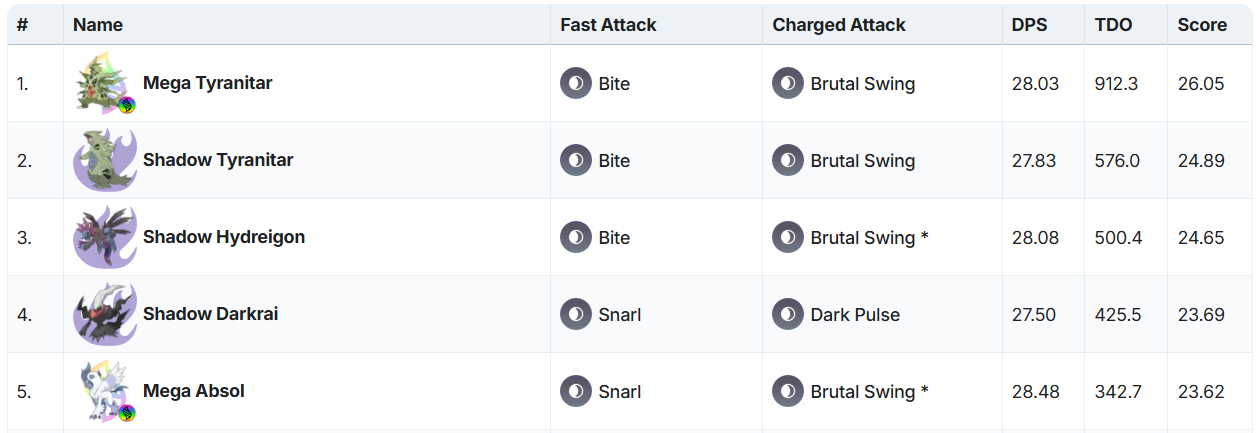 Mega Absol carves out Dark dominance with Snarl and Brutal Swing, excelling against Psychic and Ghost, while also providing mega boost to other Dark attackers as well, though its low TDO and Brutal Swing being a legacy move may cause Trainers to look at other Dark attackers. However, it still is a Top Dark Attacker and if you can invest in one, you definitely should.