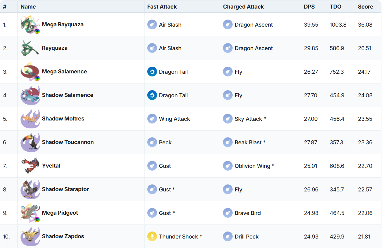 Mega Pidgeot unleashes devastating type pressure via Gust into Brave Bird, shredding Fighting, Grass and Bug bosses with relentless aerial assaults. Have a look at Top Flying Attackers: